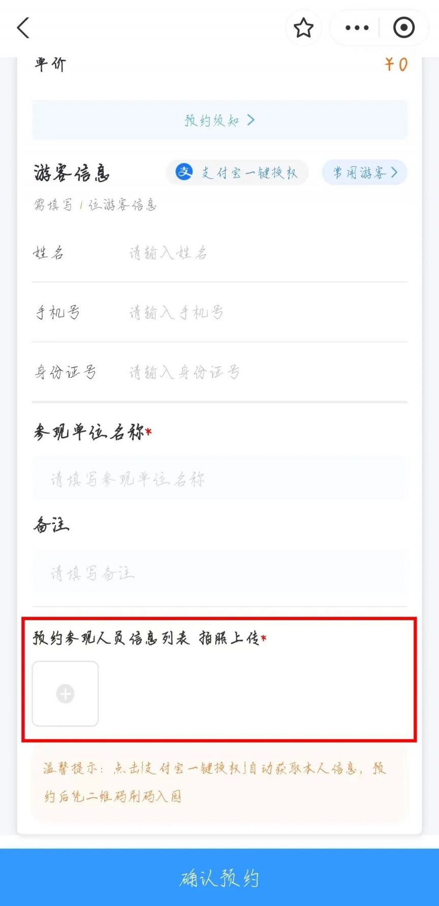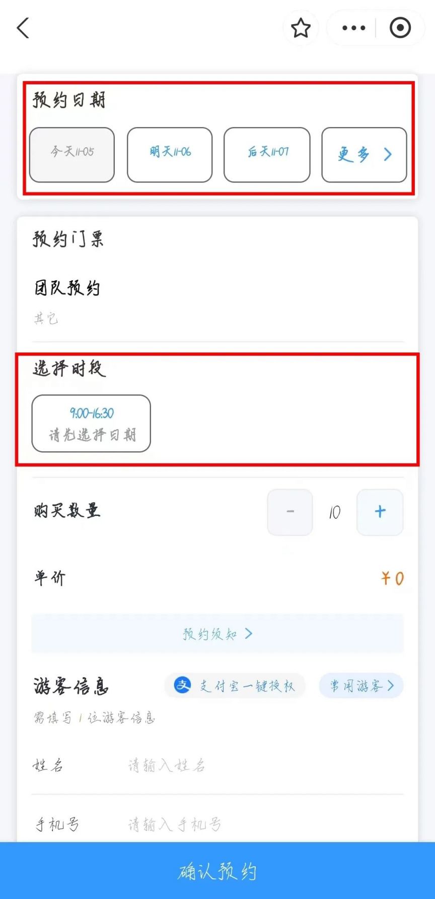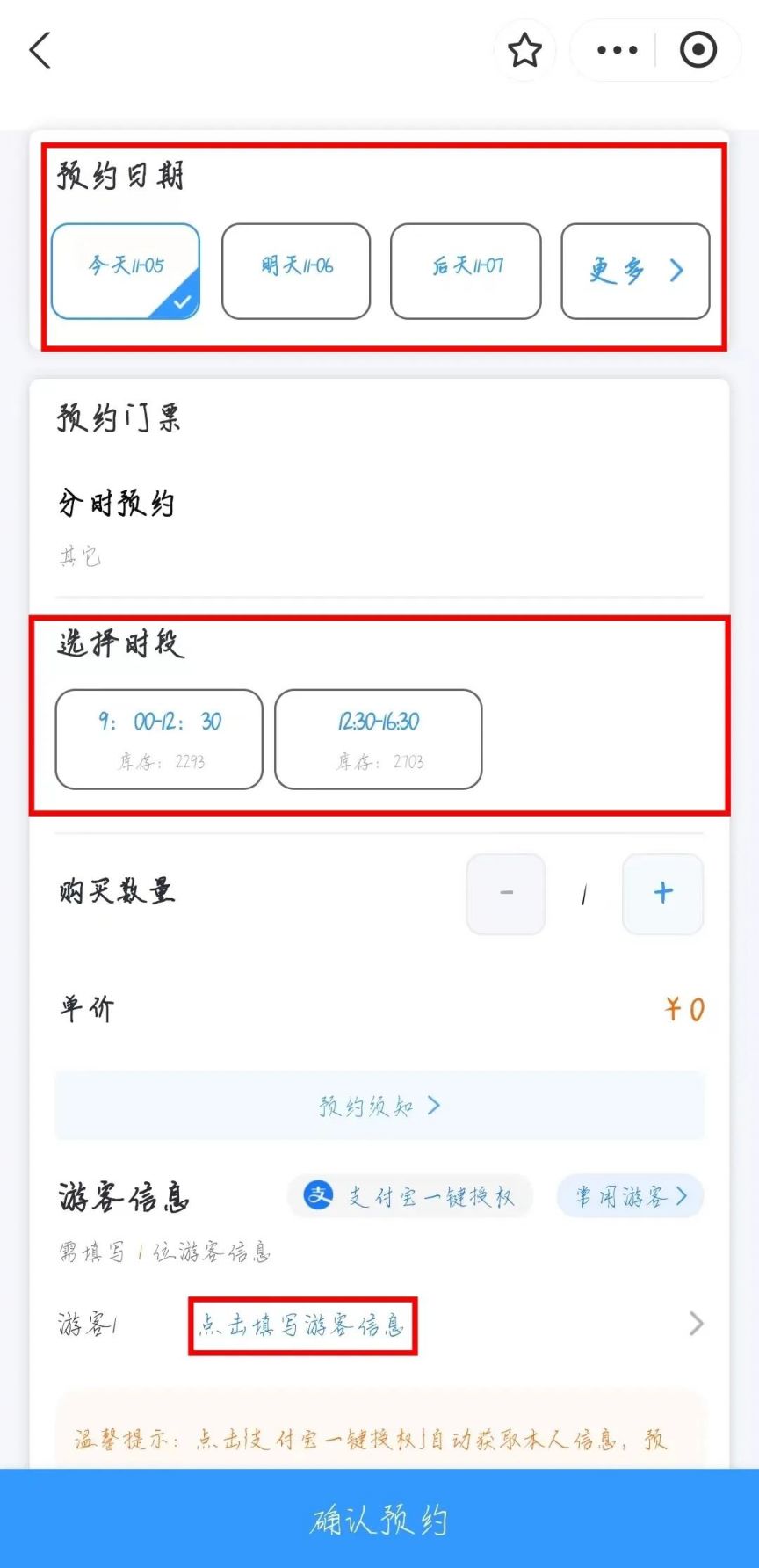 (1)个人预约:实名预约。一个账号每天限预约2次,单个账号单次最多实名预约10人;按步骤选择“预约日期”“选择时段”“购买数量”,点击“新增”添加“游客信息”,确认信息填写无误后点击“确认预约”。
