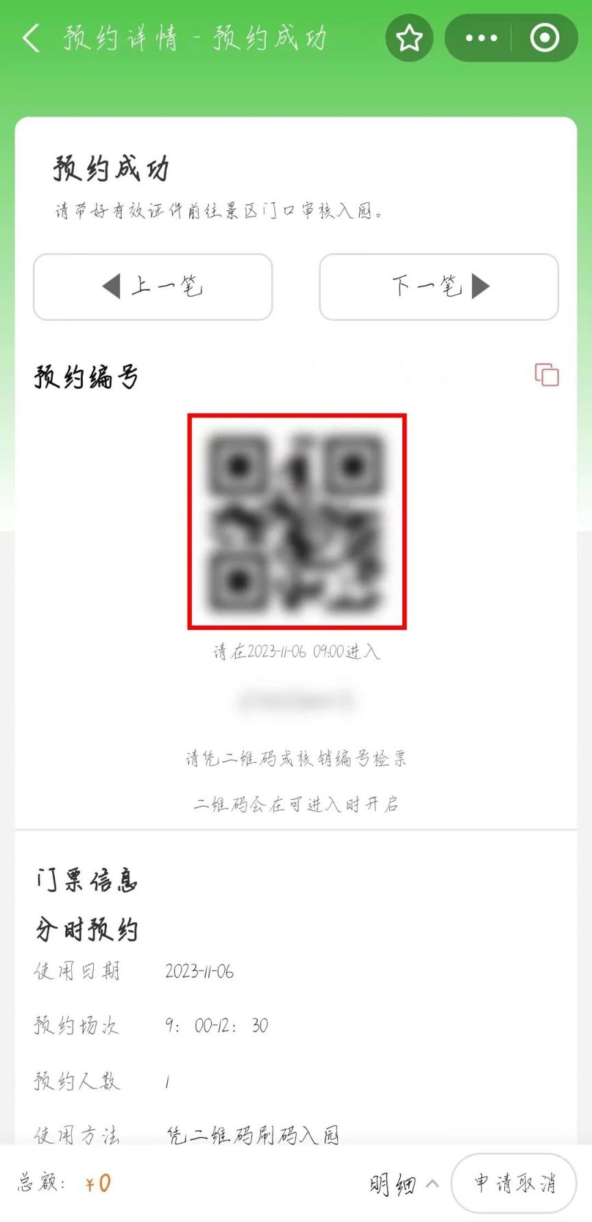 ❸预约完成后,系统自动生成预约码(预约码仅在预约时段内显示)。入馆时,出示预约码即可,错过预约时段将谢绝入馆。