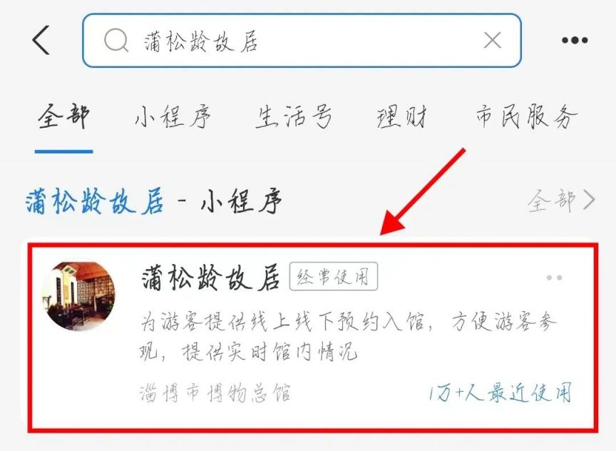 ❶进入手机“支付宝”APP,搜索“蒲松龄故居”小程序,并点击进入。
