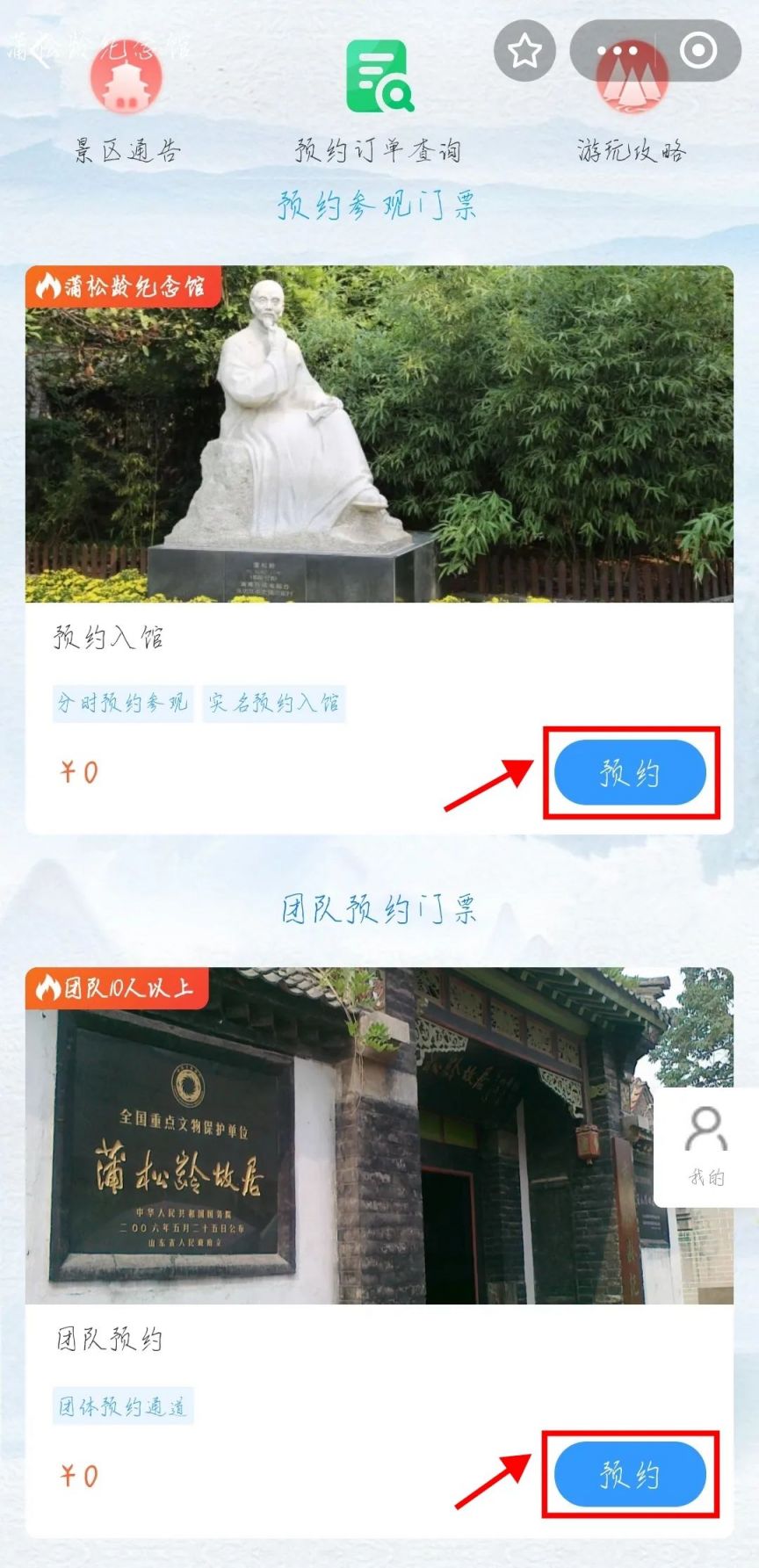 可关注“蒲松龄纪念馆”微信公众号进行预约登记,预约步骤同上。